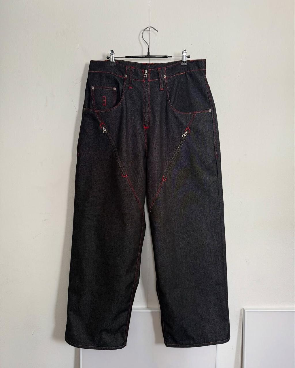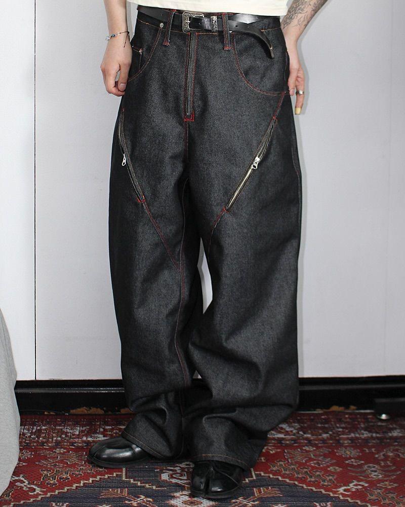 The Zipscar Denim is crafted in heavyweight black denim with a structured wide-leg fall that stacks naturally at the hem. Angular seam construction carves the silhouette, while exposed metal zip detailing cuts through the legs like scars — functional, aggressive, intentional.