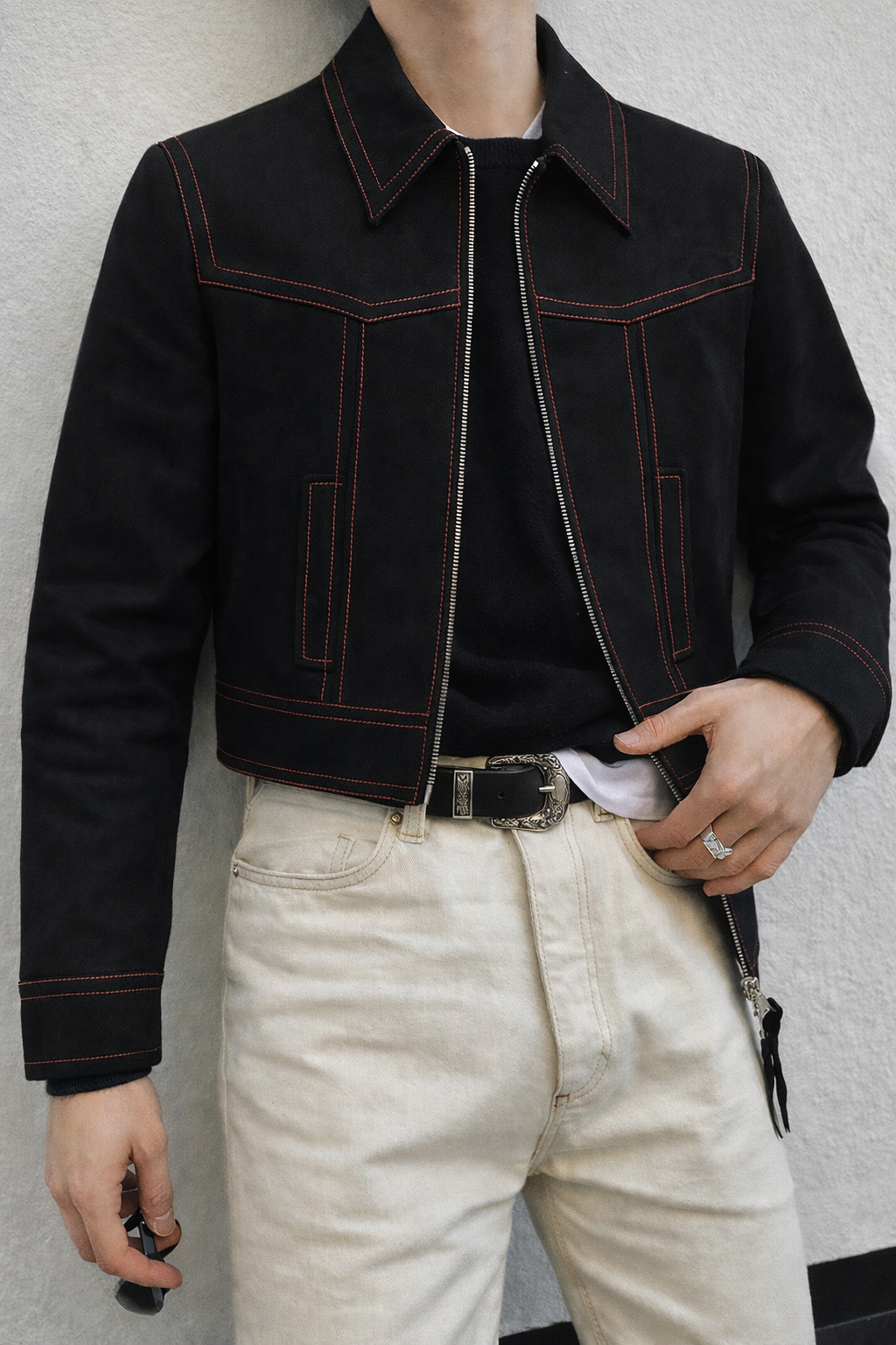 Its cropped silhouette delivers a sharp, modern salute — a perfect blend of clean tailoring and edgy craftsmanship. Each piece is finished stitch-to-stitch by hand, ensuring authenticity, durability, and a premium artisanal feel.