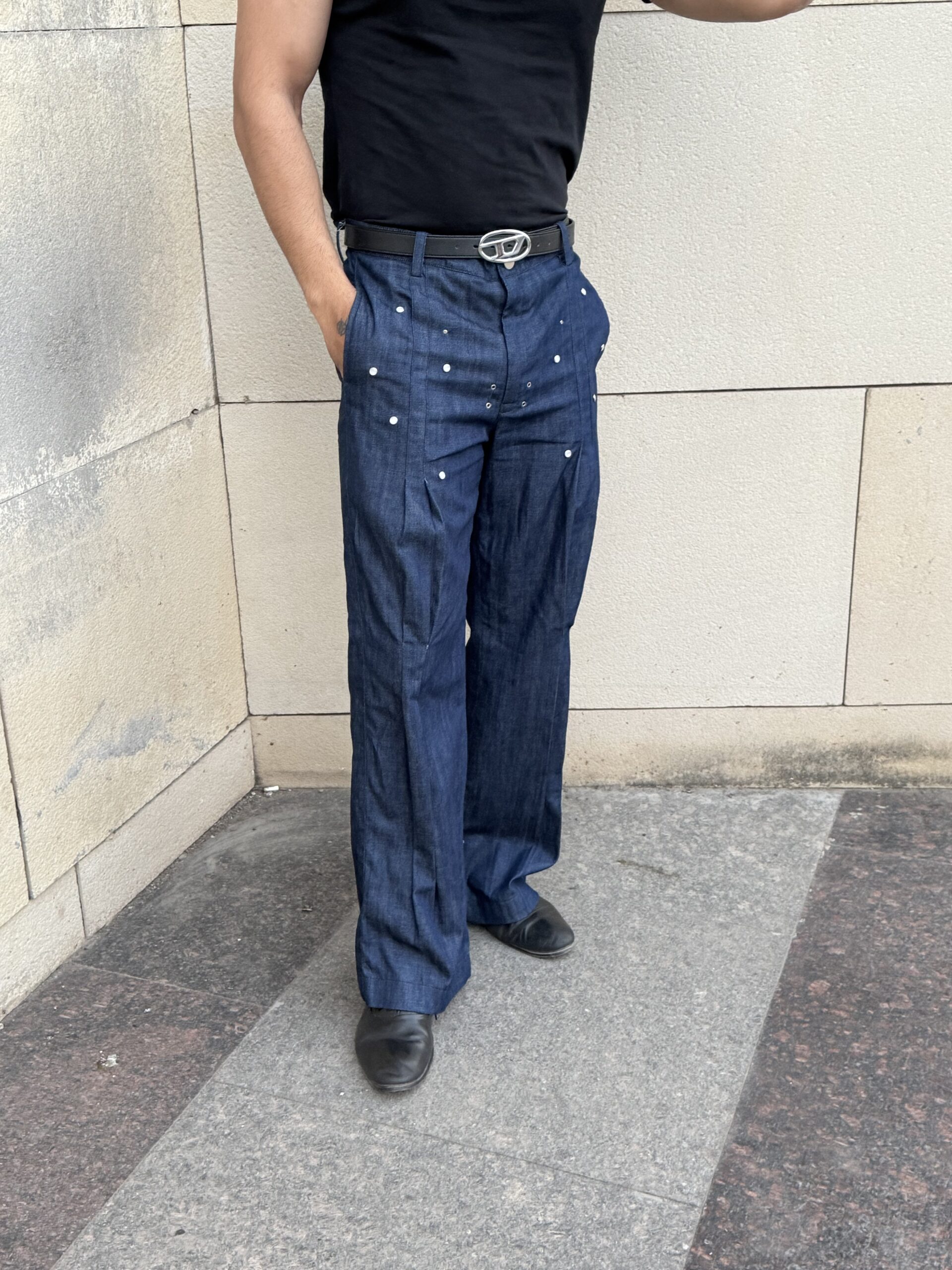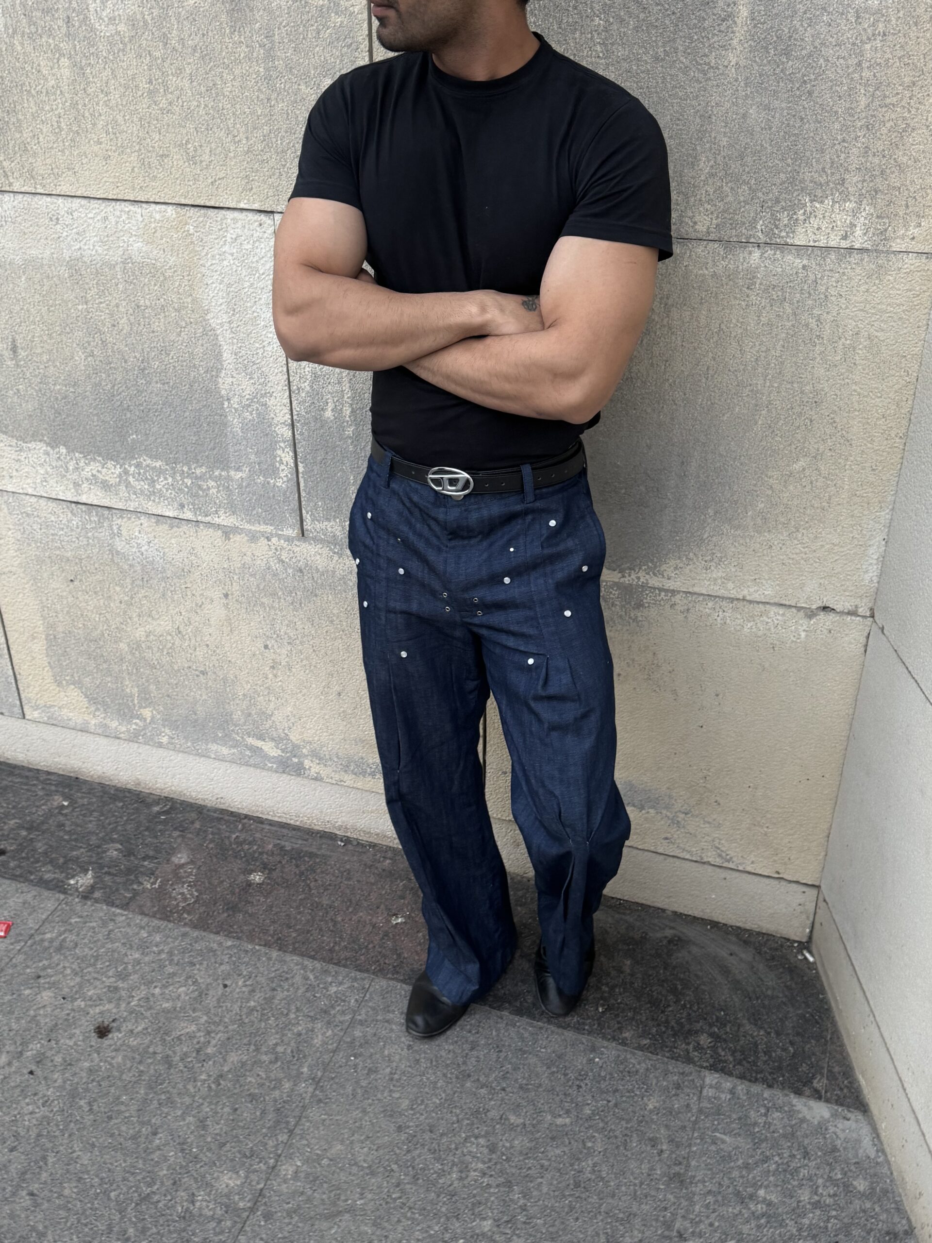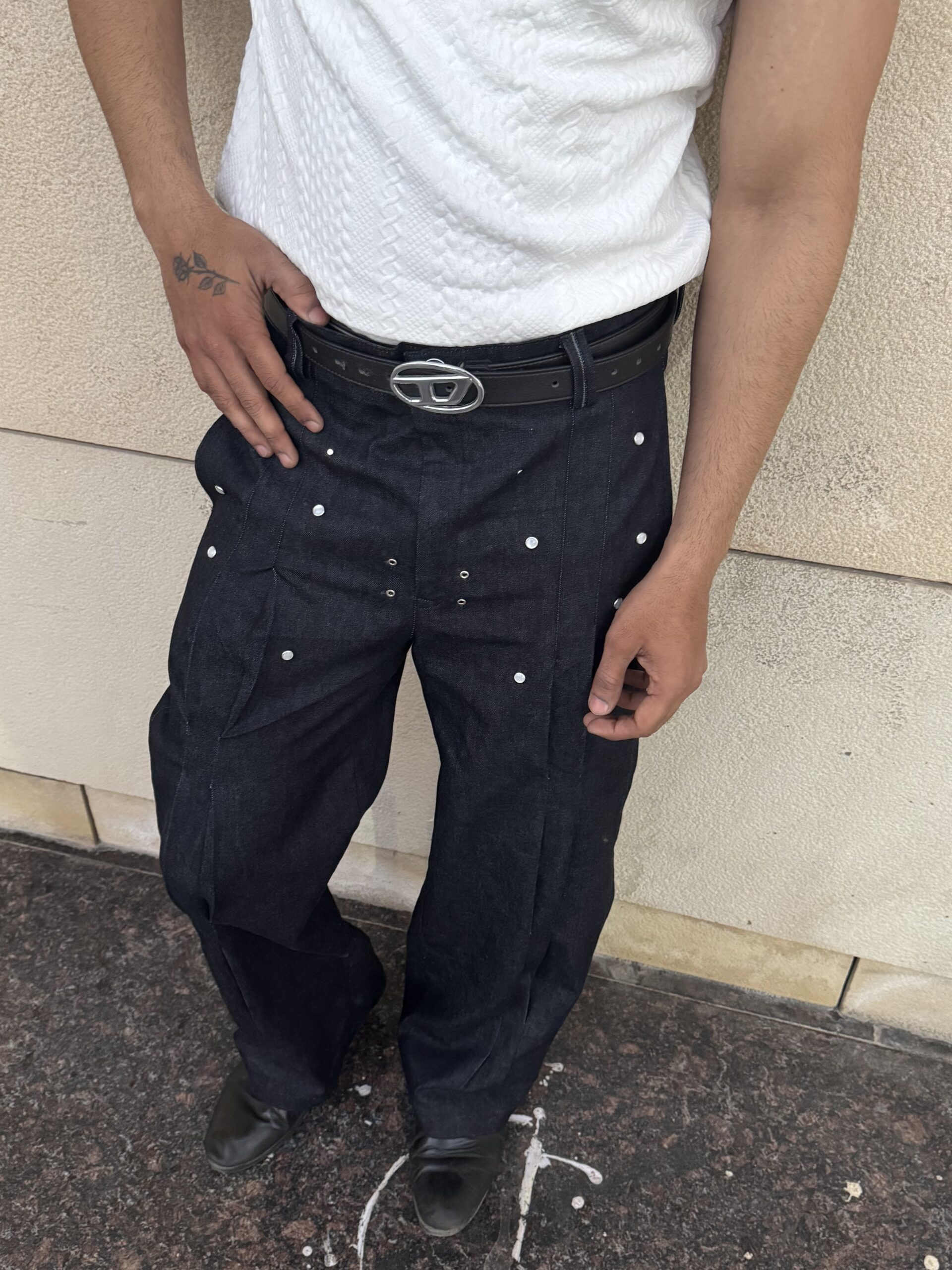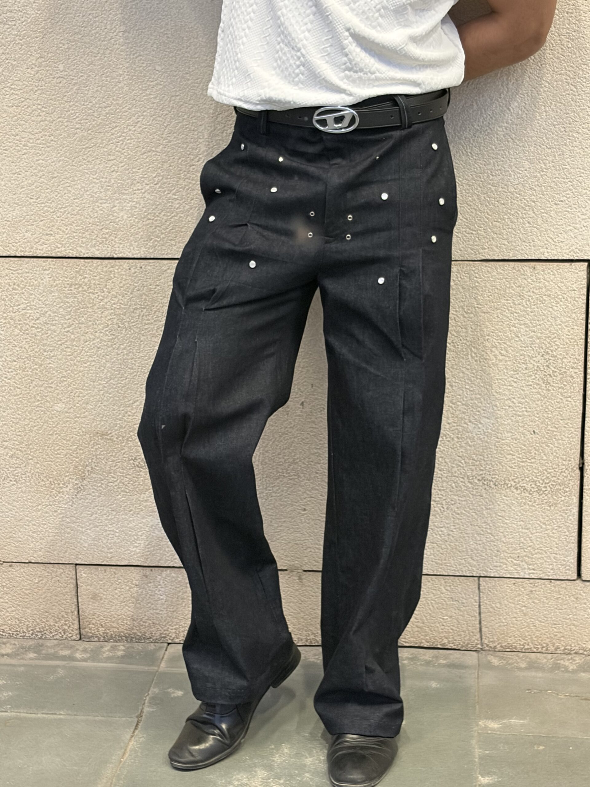 Hand-placed metal studs sit across the waistline like a polished salute, giving the denim a futuristic yet raw attitude that stands out on the streets. Crafted in heavyweight premium denim with a smooth drape, these jeans are built for both durability and design — a perfect fusion of rebellion and refinement.